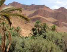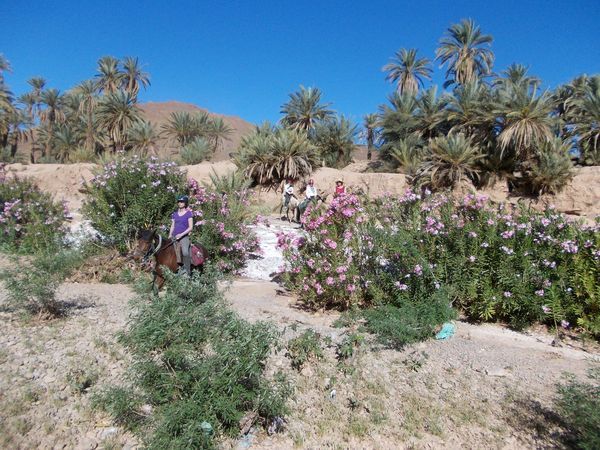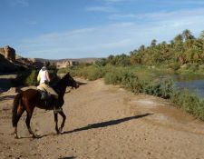 Am Vormittag reiten Sie über eine Ebene mit hellem Sand und vereinzelten Palmengruppen. Der Boden verändert sich, wird zunehmend dunkler wegen der vielen kleinen schwarzen Steine. Hier wachsen nur noch Akazien. Die schwarzen Steine werden immer größer und Sie müssen das Tempo verlangsamen. Sie nähern sich der kleinen und verschlafenen Oasenstadt Akka in riesigen Palmenhainen. Die Bewohner sind Berber, die von der Oasenwirtschaft leben und Getreide, Gemüse, Datteln, Oliven und Weintrauben anbauen. Sie reiten zu einem Restaurant im Ort, wo Sie die Pferde draußen anbinden können. Wegen der nahe Grenze zu Algerien ist Akka auch ein Militär-Stützpunkt. Das einzige Hotel ist keinesfalls zu empfehlen. Am Nachmittag folgen Sie den schmalen Pfaden der Einheimischen durch die Palmenhaine, Gemüse- und Getreidefelder bis zum Camp. Es ist am Fluss Adaka in grüner Umgebung aufgeschlagen.