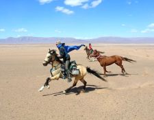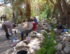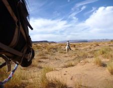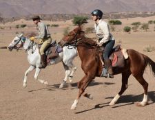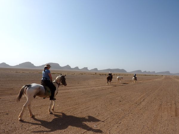 Am Vormittag sind lange Galoppaden über den hellen bis weißen Sand angesagt, zur Freude aller die ein flottes Tempo lieben. Der helle Sand geht allmählich in eine Ebene mit kleinen schwarzen Steinen über, die immer zahlreicher werden. Sie treffen auf vereinzelt stehende Akazienbäume und erreichen ein weites Tal, das von schwarzen Bergen eingerahmt ist. Gemütliches Picknick zum Lunch im Schatten von Palmen. Am Nachmittag folgen Sie dem Tal, in dem die Palmen in kleinen Gruppen wachsen. Vorbei an braunen Bergen erreichen Sie erneut eine Ebene mit hellem Sand und können die Pferde wieder laufen lassen. Das Ziel heute ist der einzige Brunnen in einem Radius von vielen Kilometern, an dem das Camp unter Palmen aufgeschlagen ist.