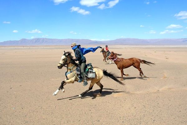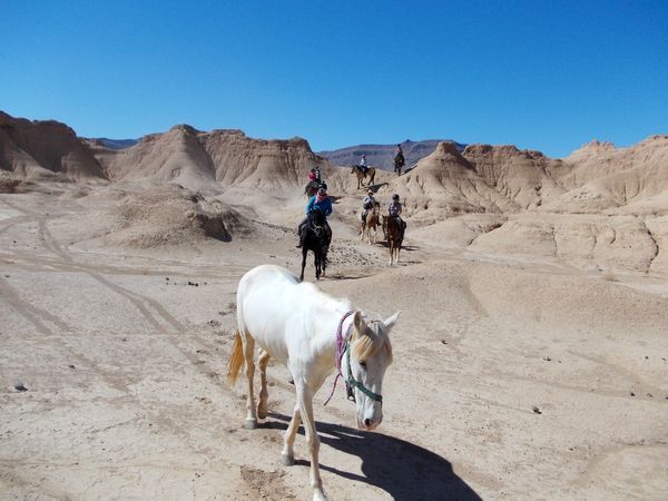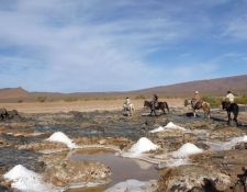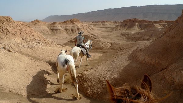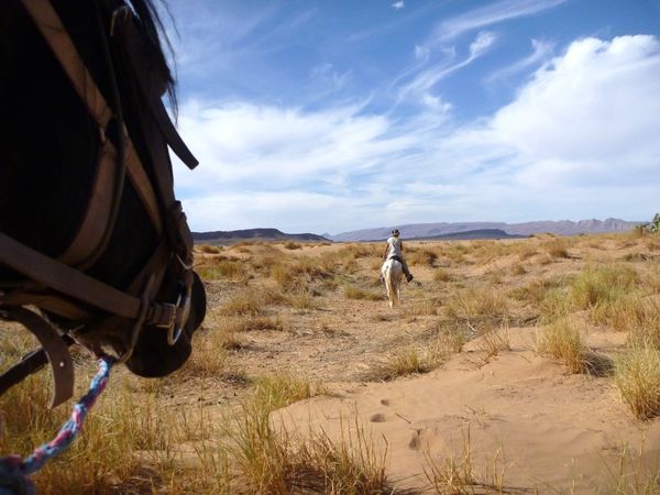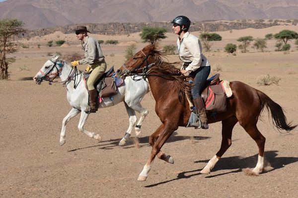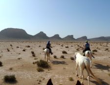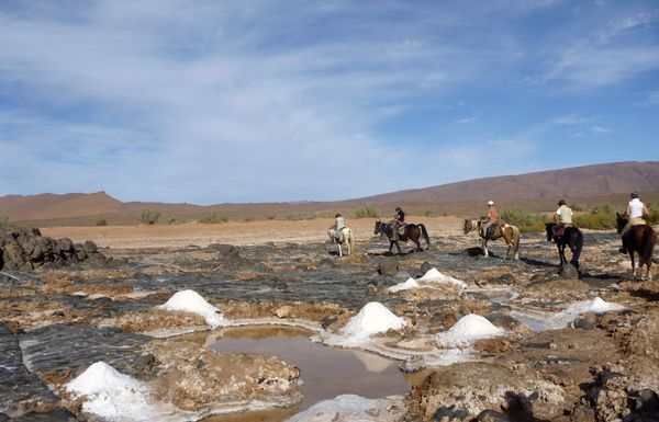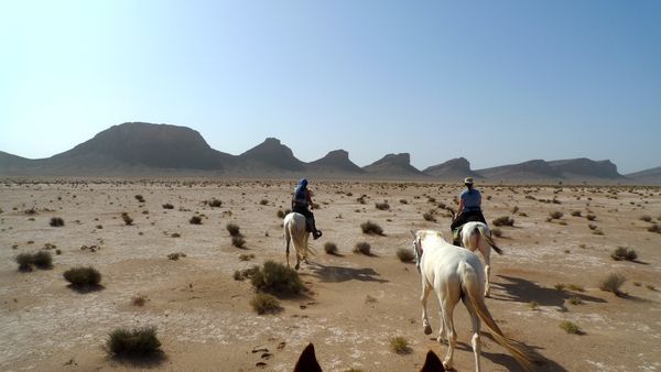 Der Ritt führt über eine weite Ebene zu den seltsam gestalteten Bergen in verschiedenen Formen wie Haifischflossen, Zähne, Schlangenköpfe oder eine Tajine. Aus der Nähe wirken die Berge jedoch völlig anders und verändern sogar die Form. Sie reiten durch die Berge bis zu einem Wasserloch mit ein paar Palmen. Die Pferde können hier trinken und im Schatten lässt sich gut picknicken. Auch die Nomaden kommen mit ihren Herden hierher, es ist die einzige Wasserstelle in weitem Umkreis. Am Nachmittag sind Sie flott unterwegs und galoppieren über die sandige Ebene mit ein paar einsamen Akazienbäumen.