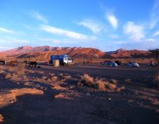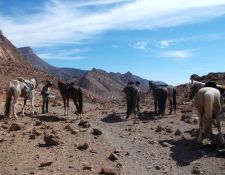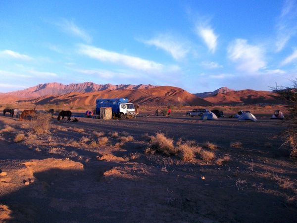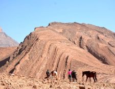 Der Ritt führt heute über eine dunkle steinige Ebene in Richtung von Pyramidenbergen, die in hellbraunen Farbtönen schimmern. Den Vormittag über reiten Sie durch die Berge und überwinden die eine oder andere Hügelkette. Die Rast zum Picknick-Lunch ist eine wohlverdiente Pause für Pferde und Reiter, um sich für den nächsten Teil des Weges zu stärken. Der Nachmittag bringt noch eine letzte Bergkette, die es zu überwinden gilt. Danach ist das Gelände eben und sandig, also ideal für schöne lange Galoppaden. Das Camp ist im grünen Palmenhain von Kasbah aufgeschlagen.