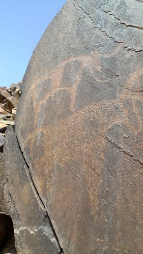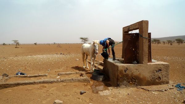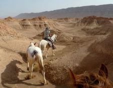 Sie reiten heute über den Grund eines ausgetrockneten Stausees, der sehr selten Wasser hat, und folgen dem ebenfalls trockenen Flussbett. Offensichtlich gibt es flaches Grundwasser, denn es wachsen hier Büsche und Sträucher. Der Boden wird sandiger und der Wind hat viele kleine Sanddünen angehäuft. In der Ferne sehen Sie eine schwarze faltige Bergkette, die hoch mit rotem Sand bedeckt ist. Die schwarze Ebene mit Kieselsteinen ist durchsetzt mit Akazienbäumen und wird von kleinen Bergen unterbrochen, die teilweise auch mit rotem Sand bedeckt sind. Irgendwo hier ist ein geeigneter Platz für die Mittagsrast mit ein wenig Schatten. Erholt machen Sie sich auf den Weg in Richtung des Berges, der wie eine Tajine geformt ist, und erreichen später ein weites Tal, das ins ‚Niemandsland‘ führt. Das Gelände ist ideal für einen langen Galopp in Richtung einiger Bergrücken in der Form von Haifischflossen. Das Camp liegt in einer einsamen Oase mit Palmen und einem Brunnen.
