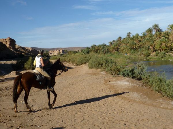 Am Morgen fahren Sie mit dem Auto von Ouarzazate in Richtung Westen, die Fahrt dauert ca. 5 Stunden. Die Pferde warten auf Sie in einem Palmenhain bei Tata, einer kleinen Stadt mit schönen Oasengärten und die in kaum einem Reiseführer zu finden ist. Nach einem kleinen Imbiss brechen Sie auf zu einem Einführungsritt, um sich mit dem ausgewählten Pferd vertraut zu machen. Der Ritt führt durch Palmenhaine und vorbei an Kasbah-Dörfern, die auf Hügeln liegen. Es gibt gute Gelegenheiten für lange Galoppaden durch weißen Sand und entlang einer schwarzen Felswand, die von hellem Sand eingerahmt ist. Das Camp liegt in einem Palmhain mit Oleander und Tamarisken an einem Fluss.
