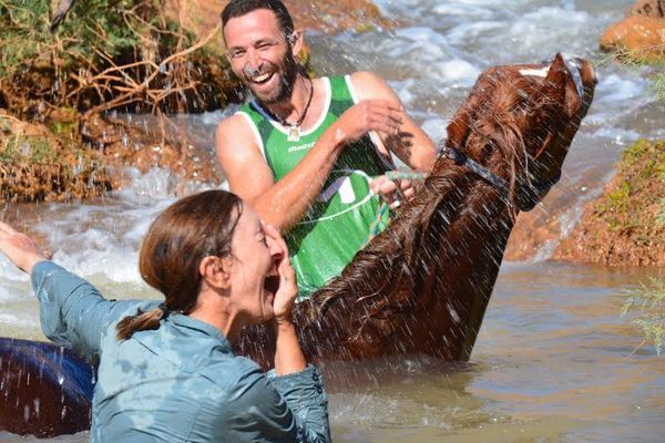 Ein schöner Galopp lässt Sie über die weite Ebene mit hellem Sand ‚fliegen‘, die nur von einzelnen Palmen unterbrochen wird, bis Sie zu einer dunklen Bergkette kommen, die wirkt als wäre Sie zusammengefallen. Dann geht es weiter über eine gelbliche Hochebene mit vielen kleinen Schluchten und Tälern, die von Wind und Wetter geschaffen wurden. Bald darauf steigen Sie hinab in ein schönes Tal mit Palmen und einem Fluss mit klarem Wasser. Sie folgen dem Flusslauf durch das Tal bis zum Wasserfall von Atiq, der einen großen natürlichen Pool geformt hat. Ein wunderbarer Platz für das Picknick zu Mittag und schwimmen können Sie auch in dem kühlen salzhaltigen Wasser. Bei Tissint reiten Sie erst durch einen Palmenhain und kommen auf eine mit schwarzen Felsen eingerahmte Sandebene und können die Pferde gut und lang laufen lassen bis zum Fluss. Das salzhaltige Gewässer schlängelt sich durch Gebüsch und Palmen, ist aber für die Tiere genießbar. Das Camp ist im Palmenhain von Mghirima aufgeschlagen.