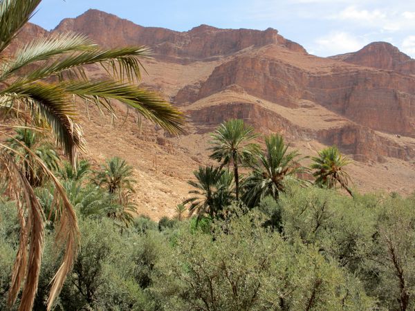 Sie verlassen den Palmenhain und gelangen auf eine weite Ebene in gelblicher Farbe und vom Wind geformt. Die Erosion hat viele kleine Schluchten und Täler geschaffen und es ist nicht einfach in dem Labyrinth den richtigen Weg zu finden. Dann öffnet sich ein weites sandiges Tal mit gutem Boden zum Galoppieren. Am Ende klettern Sie über einen steinigen Pass und genießen oben auf der Passhöhe ein wunderschönes Panorama über die unzähligen Täler in der Umgebung. An einem schattigen Platz machen Sie Halt für das Picknick zu Mittag. Wie die Alpen sind auch die einzelnen Ketten des Atlas Faltengebirge und dass lässt sich unterwegs deutlich an der braune Bergkette beobachten. Ihr Lager für die Nacht ist im Palmenhain bei Imitek.