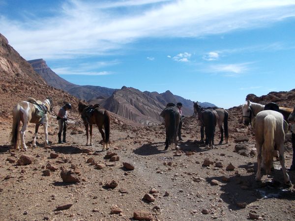 Heute steigen Sie wieder in den Sattel um das Abenteuer fortzusetzen. Der Weg führt über eine Ebene mit Akazienbäumen, die verstreut wie Punkte stehen. Sie kommen an vielen kleinen Palmenoasen vorbei und manchmal finden Sie eine Quelle mitten im sandigen Nirgendwo. Zu Mittag halten Sie an einem Wasserloch und können im Schatten von Palmen und Tamarisken relaxen. Der Nachmittag hat etwas Besonderes. Sie reiten ein Teilstück auf der Route der berühmten Rallye Paris-Dakar, die zu Beginn der 80er Jahre im Januar hier entlang brauste und das beschauliche Leben der Einheimischen durcheinander wirbelte. Der Boden ist bedeckt mit Steinen und teilweise mit kleinen Kieseln und der Weg führt durch ein langes Tal, das von schwarzbraunen Tafelbergen begrenzt wird. Nach einiger Zeit erreichen Sie den schmalen Pass, der von Militär bewacht wird und Sie müssen Ihren Reisepass vorlegen. Danach erlaubt der Boden lange Galoppaden, fast bis zum Camp bei Akka Iguern.