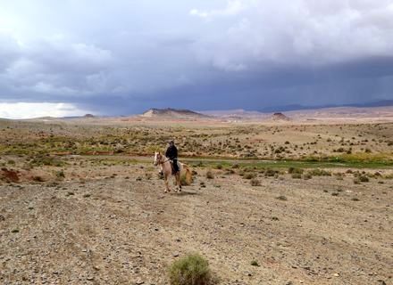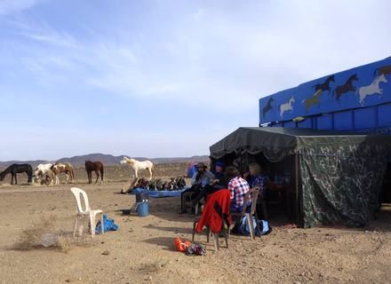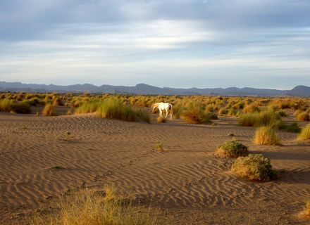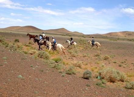 Heute reiten Sie weiter nach Süden und anfangs kommen Sie noch durch vereinzelte und verstreut liegende Dörfer. Bald jedoch wird es beinahe menschenleer und Sie sind umgeben von der unendlichen Wüste. Sie reiten durch langgezogene Täler mit steinigem und sandigen Boden, überqueren kleine Hügelketten und Sanddünen. Der Wind hat die Berge mit feinem Sand bedeckt und der glitzert in der Sonne fast wie "Pulverschnee". Manchmal treffen Sie auf eine einsame Kamelherde ohne Hirten. An einem einsamen Brunnen machen Sie Halt für ein Picknick. Am Nachmittag galoppieren Sie auf den unendlichen sandigen Flächen bis zum Camp, das allein an einem anderen Brunnen mitten in der Wüste liegt. Abendessen und Übernachtung.