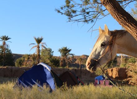 Am Morgen verlassen Sie Ouarzazate und fahren durch das Tal der tausend Kasbahs über Boumalne Dades nach Tinghir, wo die Pferde stehen. Die Fahrt durch die beeindruckende Landschaft ist ein Erlebnis für sich. Nachmittags lernen Sie Ihr Pferd kennen und starten zum ersten Ritt. Nach ca. drei Stunden im Sattel erreichen Sie das erste Camp. Unterwegs durchqueren Sie kleine Kasbah Dörfer, Palmenhaine und viele kleine fruchtbare Gärten. Dann öffnet sich eine weite Ebene und Sie galoppieren zum Camp. Übernachtung im Zelt.