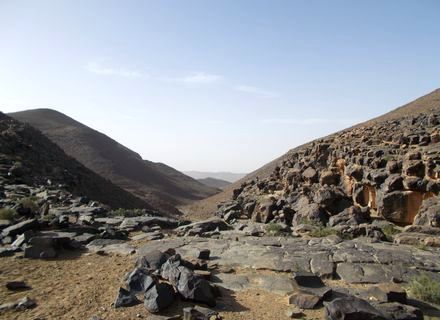 Der heutige führt erst über sandige Ebenen und durch Palmenhaine, in denen sich kleine Kasbah-Dörfer verstecken. Überall wo ein wenig ist, versuchen die Bauern jn mühsamer Arbeit kleine Felder anzulegen und Gemüse für den eigenen Bedarf anzupflanzen. Schmale Pfade verlaufen in diesen Pflanzungen und die Palmen spenden Schatten. Immer noch beeindruckend erheben sich die blau-grauen Bergketten auf der einen Seite. Das Picknick zu Mittag ist an einem schattigen Platz. Am Nachmittag folgen Sie einem trockenen Flusslauf in die Berge hinein. Die Farbe der Berge ist schwarz und einer hat die Form von einem Zahn. An seinem Fuß wachsen einige Palmen und Oleanderbüsch und es findet sich hier sogar eine kleine Quelle. Damit ist es ein idealer Platz für das Camp. Abendessen und Übernachtung.