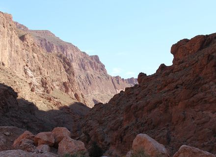 Nach dem Frühstück fahren Sie gemütlich über die Straße der Kasbahs zurück nach Ouarzazate. Die Landschaft wirkt in der entgegengesetzten Fahrtrichtung völlig anders als auf der Hinfahrt. Unterwegs können Sie die imposante Schlucht von Todrha besichtigen. Der Todrha Fluss zwängt sich durch die enge Schlucht, deren Seitenwände die Höhe von 300 m und mehr erreichen. Hier wachsen Palmen und Oleanderbüsche, weil der Fluss fast ganzjährig Wasser führt. Sie halten unterwegs zum Mittagessen in einem kleinen Restaurant und erreichen gegen Abend Ihren Ausgangspunkt Ouarzazate. Übernachtung im Hotel in Ouarzazate.