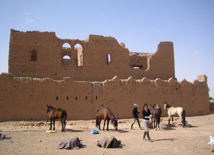 Sie verlassen das steinige Plateau und können wieder über sandige Ebenen galoppieren. Die unendliche Weite der Landschaft ist faszinierend und beinahe einschüchternd. Manchmal versammeln sich Kamelherden an einem einsamen Brunnen. Des öfteren müssen Sie kleine Sanddünen überwinden und anscheinend macht es den Pferden Spaß, ein wenig im weichen Sand zu spielen. Zu Mittag machen Sie Halt an einem alten verlassenen Fort, das früher als Militär-Stützpunkt diente. Der Lehmbau ist relativ gut erhalten und beeindruckt mit den typischen Fensterformen und schönen Verzierungen. Leider wurde alles Holz gestohlen und damit fehlen die Dächer der Gebäude und im Inneren gibt es keine Etagen mehr. Frisch gestärkt reiten Sie weiter durch grüne Palmenhaine und Oasen. Das Camp ist bei einem Brunnen in einer Oase aufgeschlagen, ein romantischer Platz. Abendessen und Übernachtung.