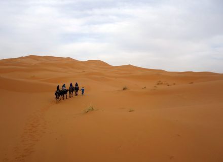 Am Morgen reiten Sie auf engen Pfaden durch den Palmenhain hinaus in die weite Wüste. Auf der unendliche Fläche voller schwarzer Steinchen wächst kein Grashalm. Der Boden ist aber ein gutes Terrain für lange Galoppaden. Das Gelände wechselt von kleinen Sanddünen zu weißen Sandflächen, deren Farbe sich dann in schwarz und gold wandelt. ln der Ferne leuchten schon die rotgoldenen Sanddünen von Merzouga, dem Tagesziel. Die kleine Oase erreichen Sie zur Mittagszeit. Nach dem langen Ritt am Morgen haben die Pferde am Nachmittag Pause und können ausruhen. Die Reiter steigen in einen anderen Sattel und reiten auf Kamelen über goldfarbene Sanddünen in den Sonnenuntergang. Das ruhige Tempo und die besondere Stimmung machen den Ritt zu einem einzigartigen Erlebnis. Mitten in den Dünen erreichen Sie ein Zeltlager von Nomaden und hier ist auch Ihr Camp aufgeschlagen. Abendessen und Übernachtung in einmaliger Atmosphäre.