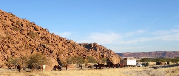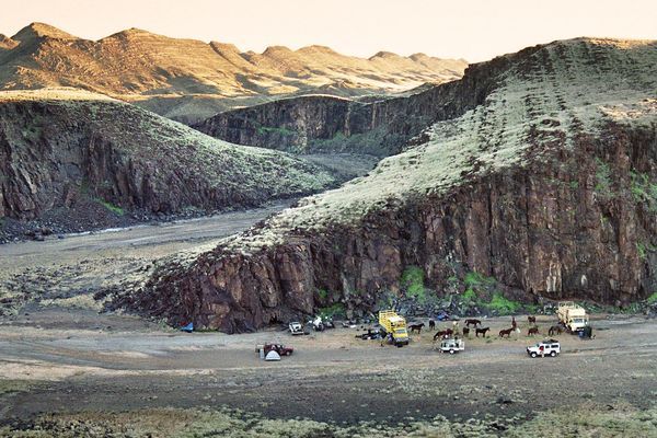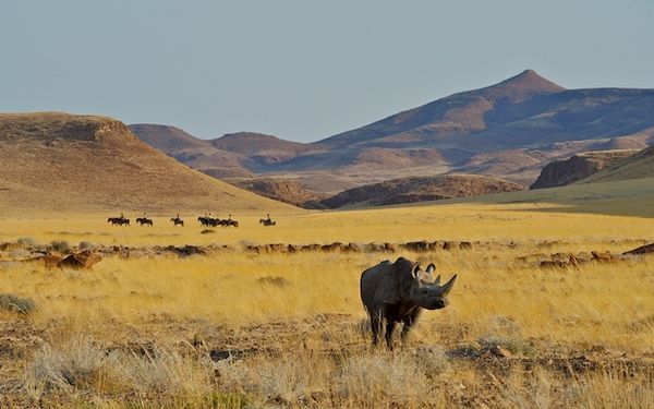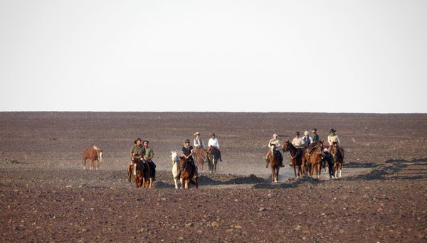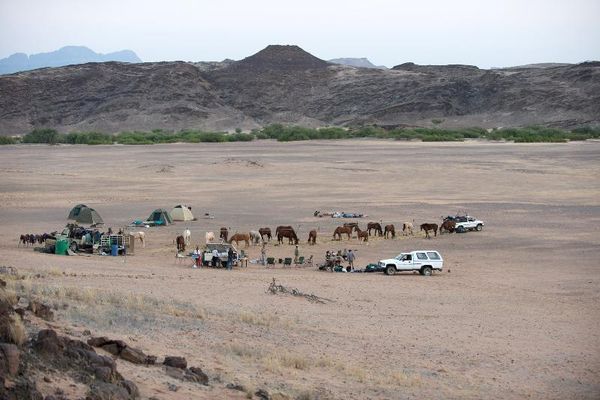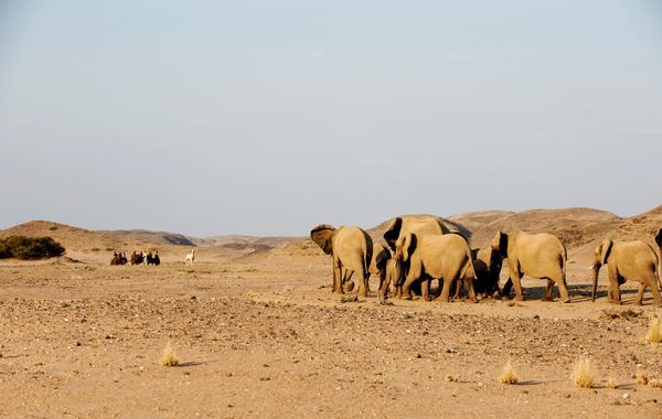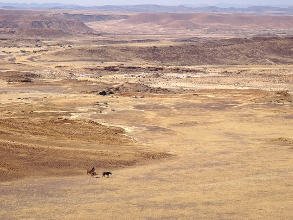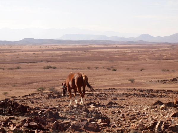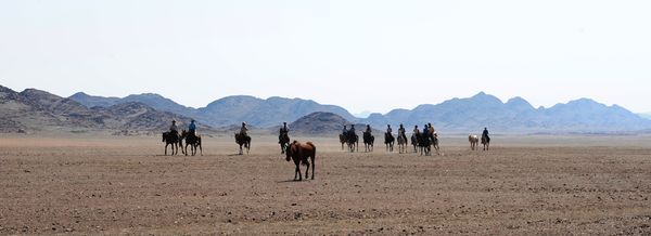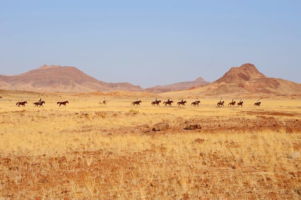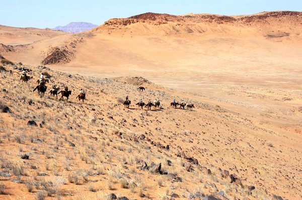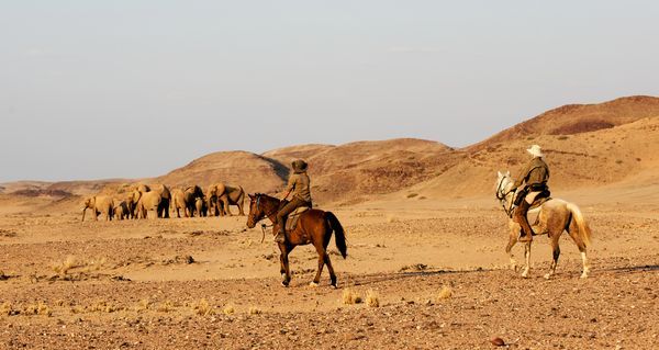 Das Damaraland erstreckt sich im Nordwesten von Namibia zwischen Erongo und der Etosha Pfanne, es grenzt im Westen an die Skelett-Küste. Die kaum erschlossene Region fasziniert mit unglaublichen Farben und der endlosen Weite. Das Gebiet ist größtenteils unzugänglich und Lebensraum der berühmten Wüsten-Elefanten und Nashörner, die sich hervorragend an die harten Lebensbedingungen angepasst haben, aber nicht an Touristen gewöhnt sind. Hier liegt bei Twyfelfontein eine der umfangreichsten Fundstätten der Welt mit Felsgravuren. Sie reiten in den oft trockenen Flussbetten des Ugab und des Huab River, durch enge Schluchten und über weite offene Ebenen. Mehrere Tage bildet Namibias höchster Berg, der Brandberg, eine spektakuläre Kulisse. Mit etwas Glück begegnen Sie Springböcken und Oryx-Antilopen, vielleicht auch den scheuen Elefanten, Nashörnern und Löwen. Ein letztes Highlight dieses aussergewöhnlichen Trails bildet die Bewältigung der Sanddünen um den endlosen Strand des Atlantischen Ozeans zu erreichen.