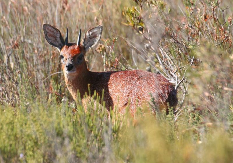 Vor dreihundert Jahren streiften Spitzmaul-Nashörner und andere große Säugetiere frei auf den Renosterveld-Ebenen umher – von den 81 Land-Säugetieren, die aus dem Kap-Pflanzenreich bekannt sind, kamen 72 früher in der Agulhas-Ebene vor. Der Bloubok, ein spektakulärer Verwandter der Roan-Antilope, lebte früher ausschließlich in den Renosterveld-Ebenen von Overberg, wurde jedoch im 18. Jahrhundert bis zur Ausrottung gejagt. Die geometrische Schildkröte – eine der seltensten der Welt – kommt nur im Renosterveld vor und ist stark bedroht. Das Renosterveld wird oft als die hässliche Schwester des Fynbos betrachtet, ist aber in Wirklichkeit ein Aschenputtel. Die meiste Zeit des Jahres sieht diese Vegetation trocken und langweilig aus, aber im Frühling verwandeln die unglaublichen Blütenpracht der zarten Geophyten und die Teppiche aus Einjährigen diese typisch graue Vegetation in ein Spektakel der Vielfalt und Farben. Es ist wirklich eine wunderbare Vegetation, die oft übersehen wird – sie hat die höchste Vielfalt an Zwiebelgewächsen aller Vegetationstypen weltweit.